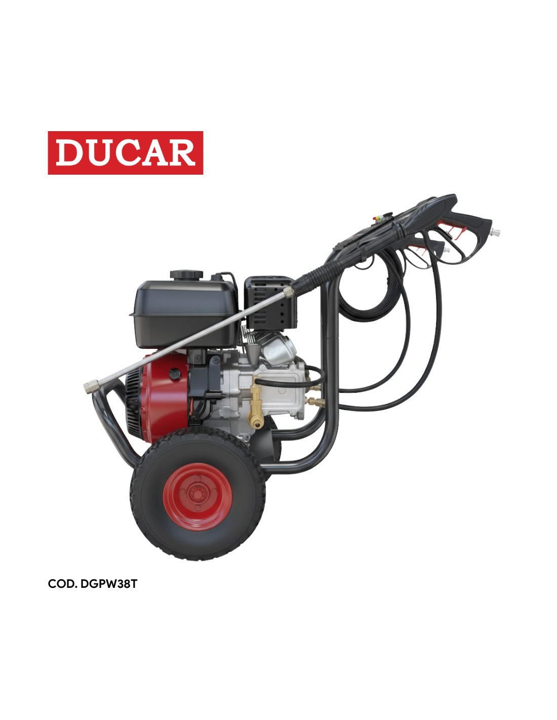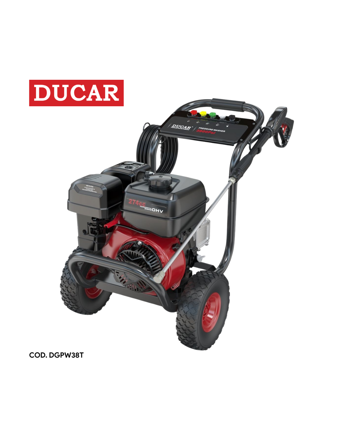La DUCAR DGPW38T ofrece presión de 3800 PSI y caudal constante para eliminar la suciedad más difícil. Equipada con un motor DUCAR de 270cc, bomba de alta presión y estructura reforzada, está diseñada para uso comercial, agrícola o de mantenimiento urbano. Su sistema de ruedas grandes permite fácil transporte.