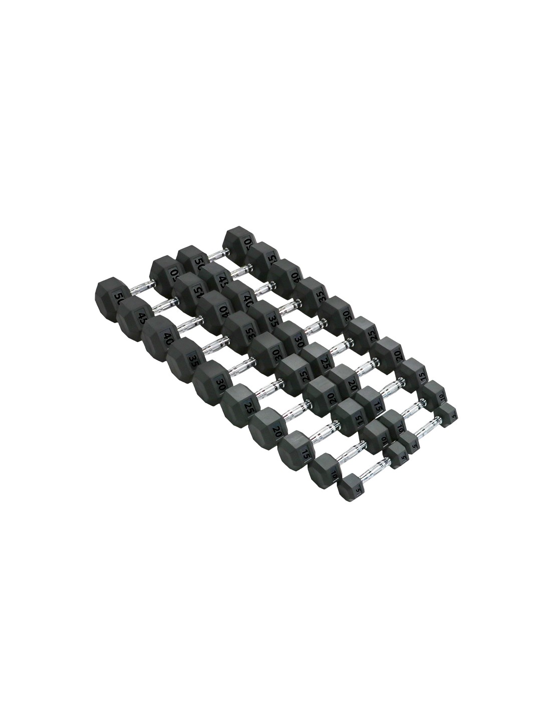 Mancuernas: estilo hexagonal de goma disponible en pares (2) de 5 a 50 libras (5, 10, 15, 20, 25, 30, 35, 40, 45, 50 libras).