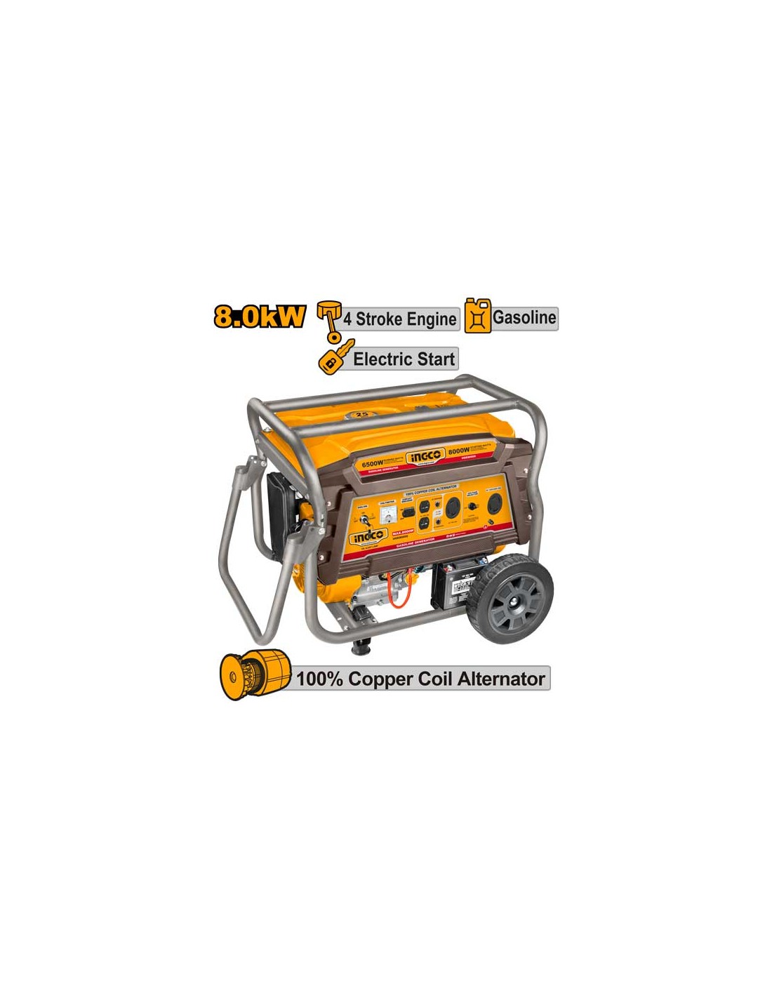 Generador INGCO de 8.0 kW máxima, motor 4 tiempos/420 ml, alternador de cobre y arranque dual.