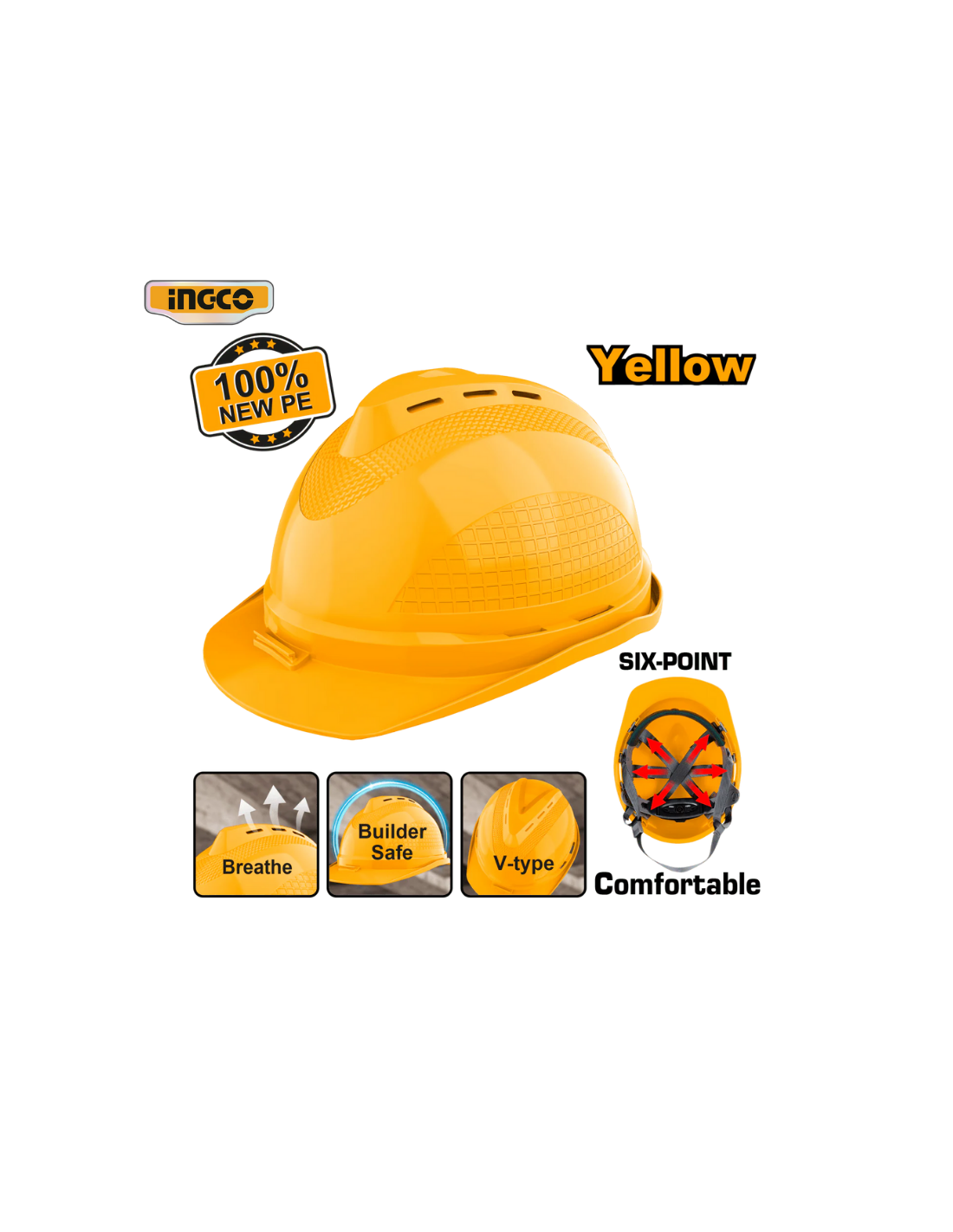 CaracterísticaEspecificaciónTipo de ProductoCasco de Seguridad (Safety Helmet).Material de la CarcasaPE (Polietileno), para alta resistencia y ligereza.Diseño de la CarcasaIncluye rejillas de ventilación.ColorGeneralmente disponible en Amarillo .Suspensión6 puntos de suspensión (interna) para absorción de impacto.Ajuste de TamañoMediante perilla de trinquete (ratchet knob) para un ajuste rápido y preciso.RefuerzoRefuerzo superior tipo "V" para mayor protección y resistencia a impactos.Accesorios IncluidosCorrea para la barbilla (barbiquejo) para mayor estabilidad.Peso Aproximado380 g (ligero para uso prolongado).
