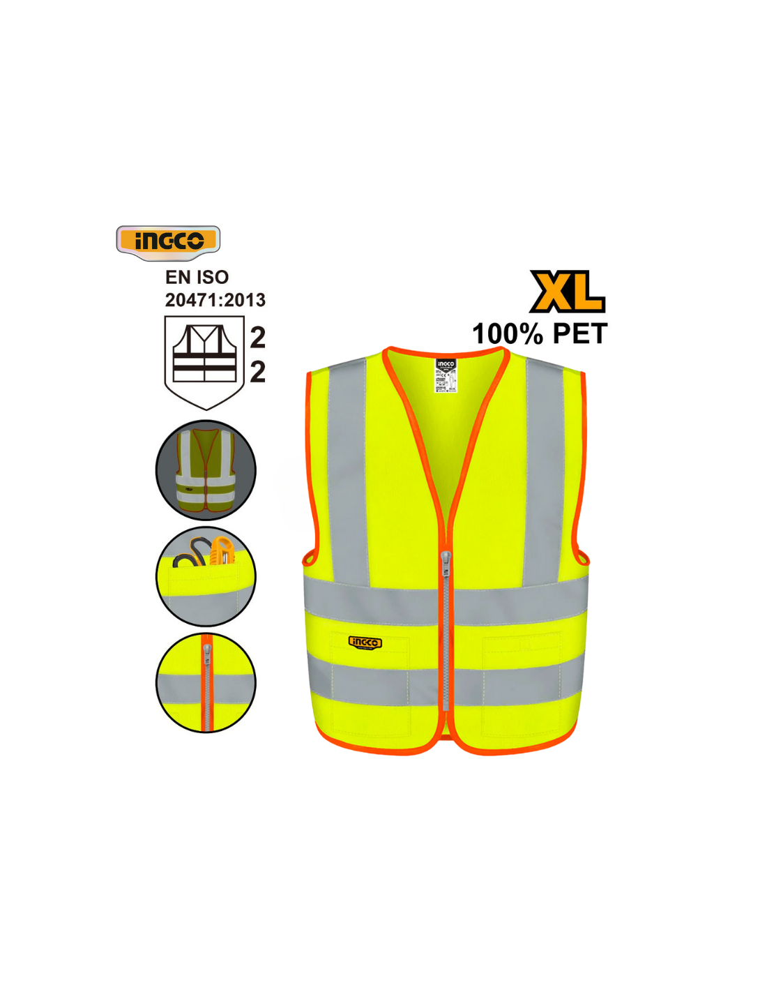 CaracterísticaEspecificaciónModeloRV83XLTipo de ProductoChaleco de Seguridad / Alta Visibilidad.MaterialTejido de punto de Poliéster.ColorAmarillo Fluorescente.TallaXL (Extra Grande).Cintas ReflectantesTiras reflectantes comunes.CierreCremallera frontal (zipper) para fácil apertura y cierre.BolsillosDos bolsillos frontales (aproximadamente ).Normativa de SeguridadCumple con la norma EN471 Clase 2 (Certificación de Alta Visibilidad).VisibilidadBorde de contraste de color y color llamativo para una máxima visibilidad.