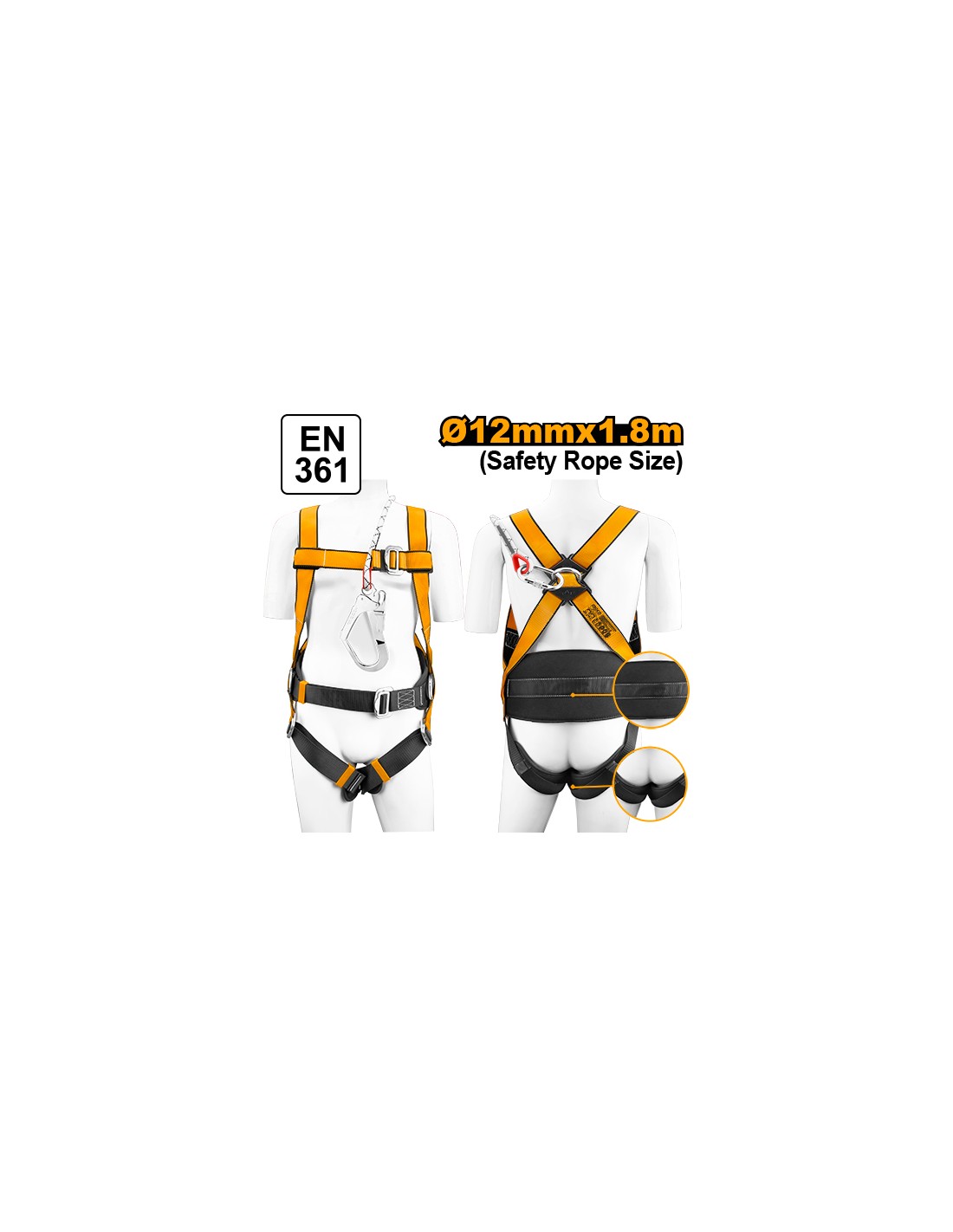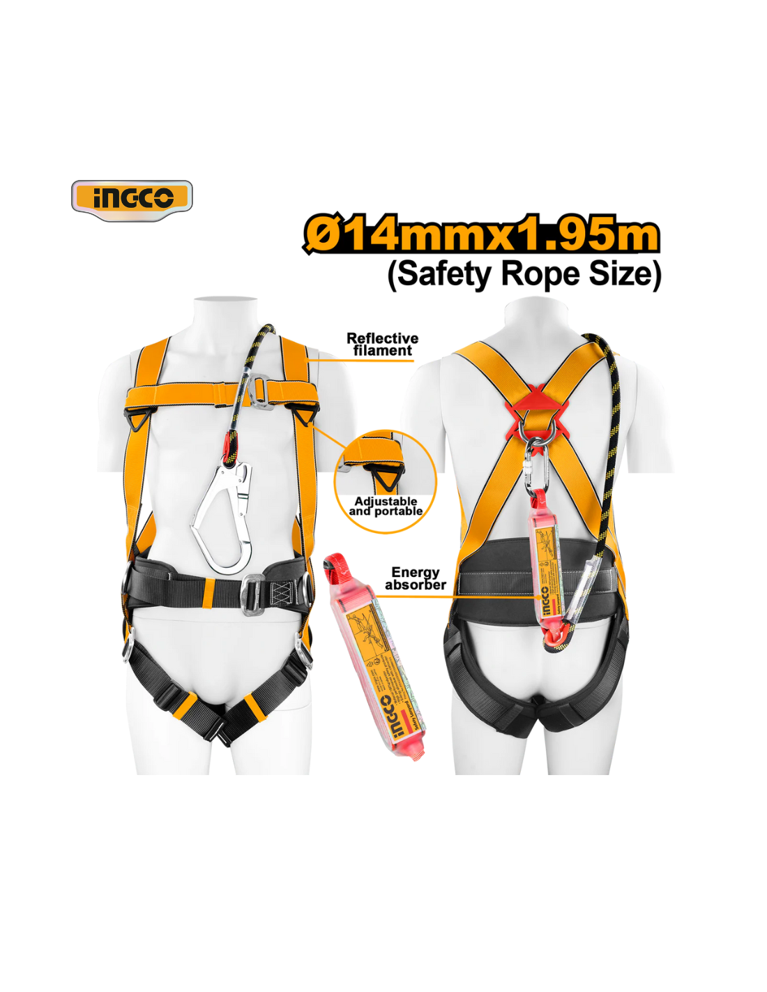 CaracterísticaEspecificaciónModeloHSH501420Tipo de ProductoArnés de Seguridad de Cuerpo Completo.Puntos de Anclaje3 Anillos D de fijación: 1 dorsal (anticaída) y 2 laterales (posicionamiento de trabajo).Puntos de Ajuste4 puntos de ajuste (en pecho, muslos y cintura) para un ajuste ergonómico.Material del ArnésPoliéster de alta resistencia.Ancho de la Correa50 mm.Cuerda de Seguridad (Línea de Vida)Incluye 1 cordón con absorbedor de energía.Dimensiones de la Cuerda de longitud.ComodidadAlmohadillas de confort acolchadas en correas de muslo y cintura.CertificaciónCumple con normas europeas EN 361:2002 y EN 358:2018.Carga Máxima100 kg de peso corporal/carga.