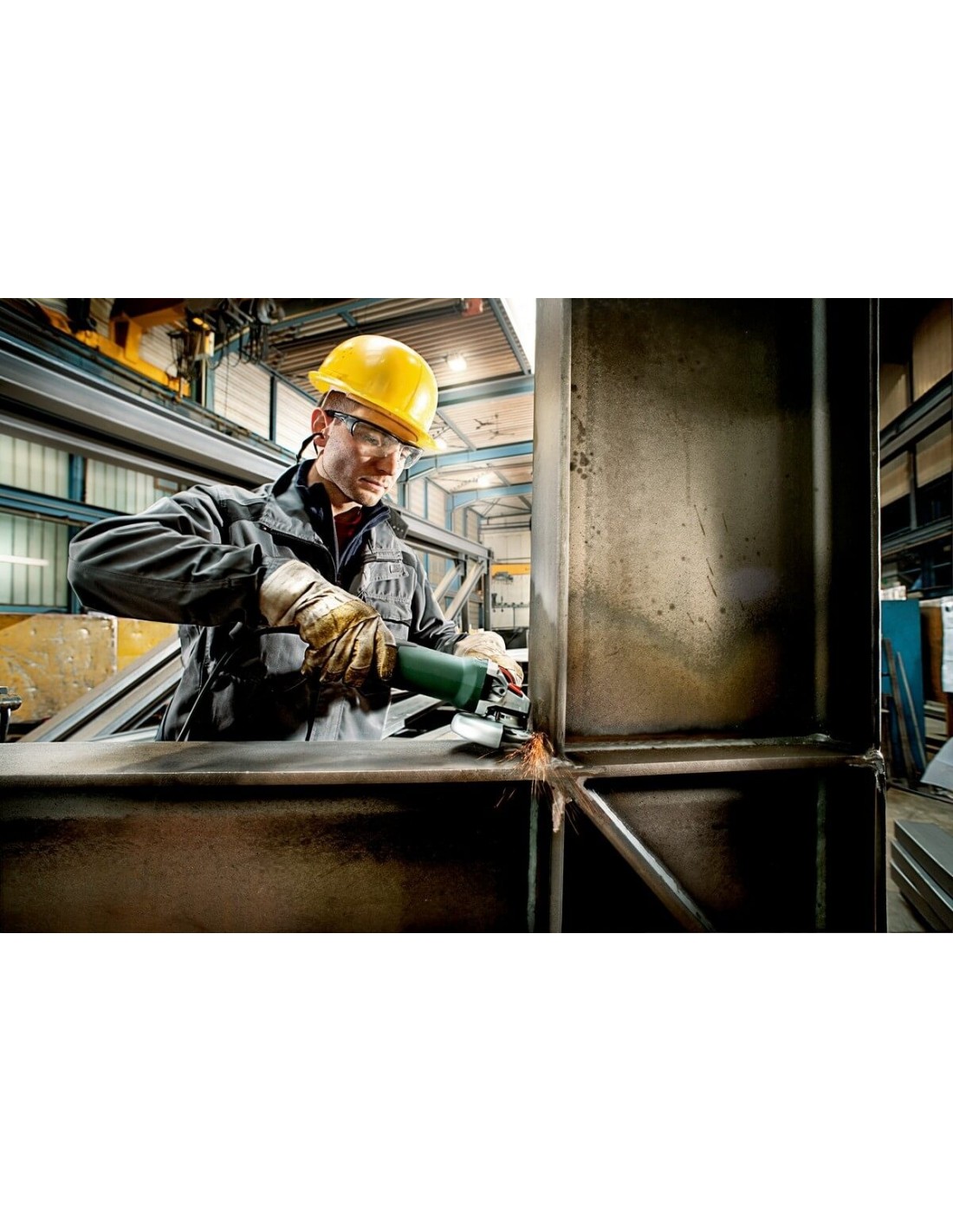 Cubierta protectora regulable sin necesidad de herramientas; se puede fijar protegida contra torsión. Empuñadura adicional VibraTech (MVT) de Metabo de pocas vibraciones. Seguro contra arranque involuntario tras un corte de corriente. La carcasa del engranaje se puede montar girando en pasos de 90° para el uso con la mano izquierda o para cortar.
