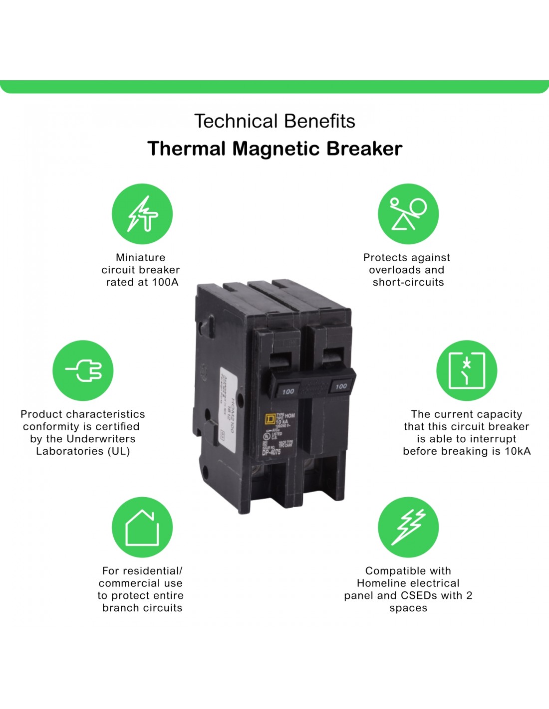 Los interruptores automáticos miniatura Homeline están diseñados y diseñados para una instalación rápida y una protección de circuito superior. Los interruptores automáticos Homeline están diseñados para conectarse a centros de carga Homeline a fin de proporcionar protección de circuito. Este interruptor proporciona protección estándar al circuito y tiene clasificación HACR. Este interruptor automático de 2 polos con montaje enchufable tiene una clasificación de 100A a 120/240 VCA. Los disyuntores HOM proporcionan una capacidad de interrupción de 10 kA.