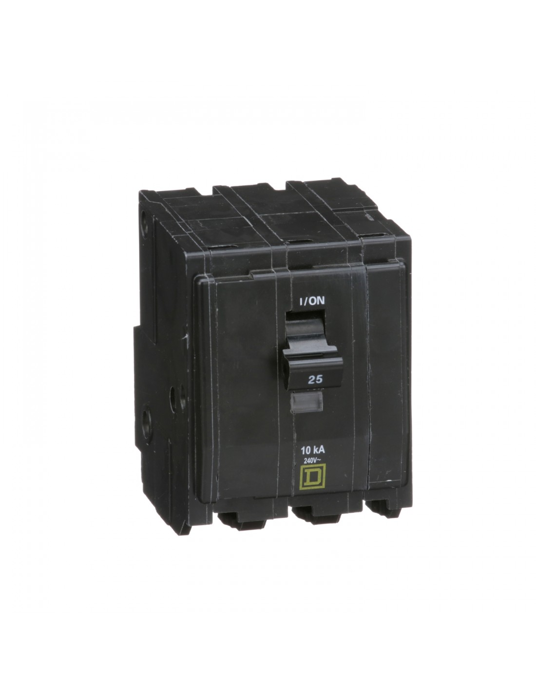 Este disyuntor QO de 3 polos tiene una capacidad nominal de 25 A a 120/240 V CA. Esta unidad proporciona una capacidad de corte de 10 kA y se monta con enchufe. También está disponible una línea completa de funciones y accesorios instalados de fábrica, como disparadores de derivación, interruptores auxiliares e interruptores de alarma.