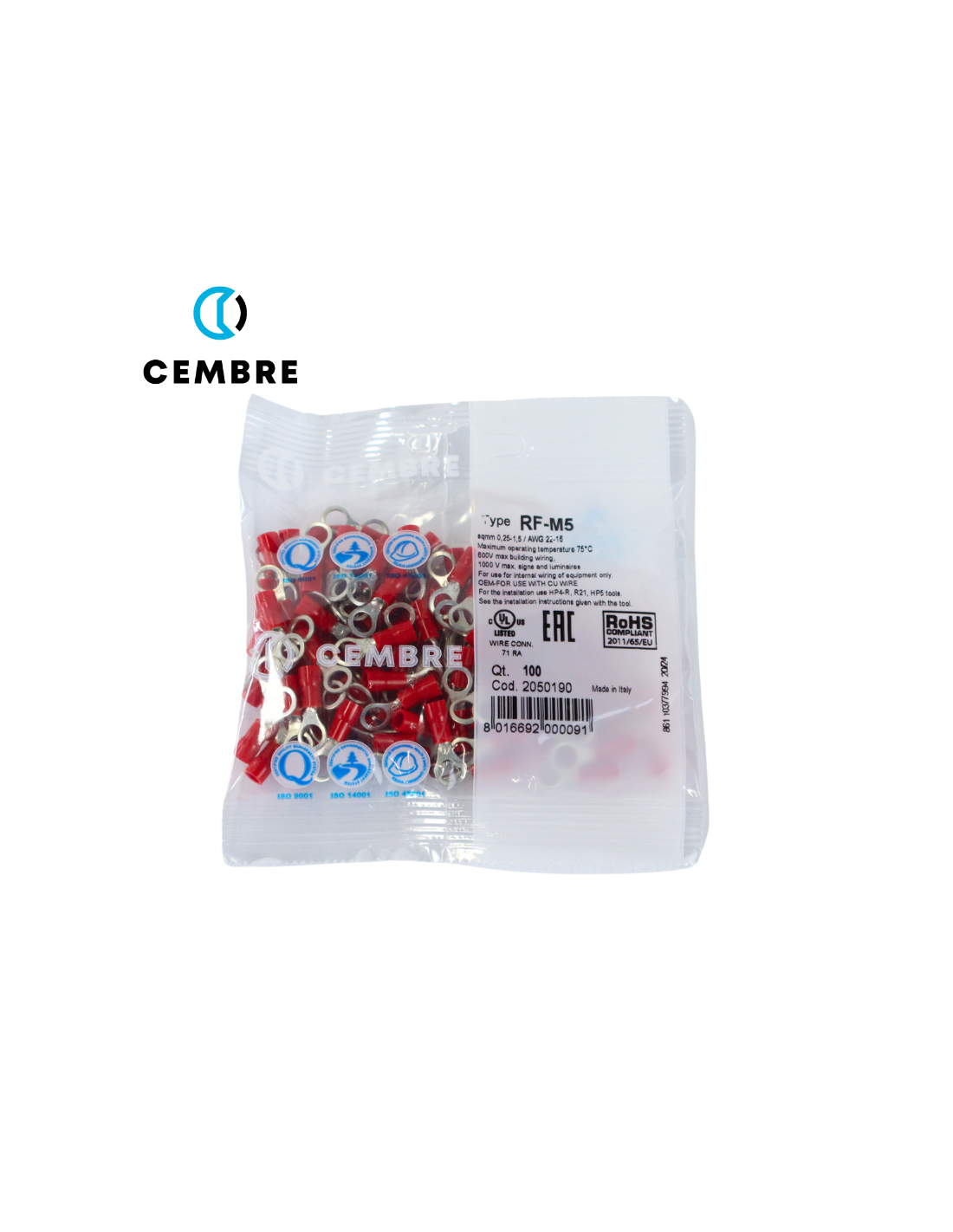 TERMINAL DE OJO PREAISLADO ROJO M5 - PARA CABLE 22-16 CEMBRE
