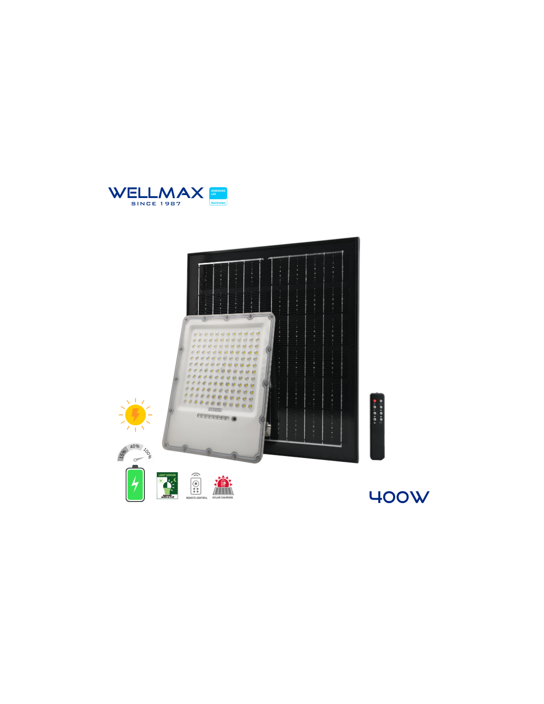 Wellmax Samsung elimina tu factura eléctrica con este reflector solar de 400W. Equipado con una batería de larga duración (21AH) y un panel solar monocristalino de alta eficiencia, garantiza luz potente toda la noche. Certificación IP65 para resistir lluvia y sol en jardines y zonas residenciales.